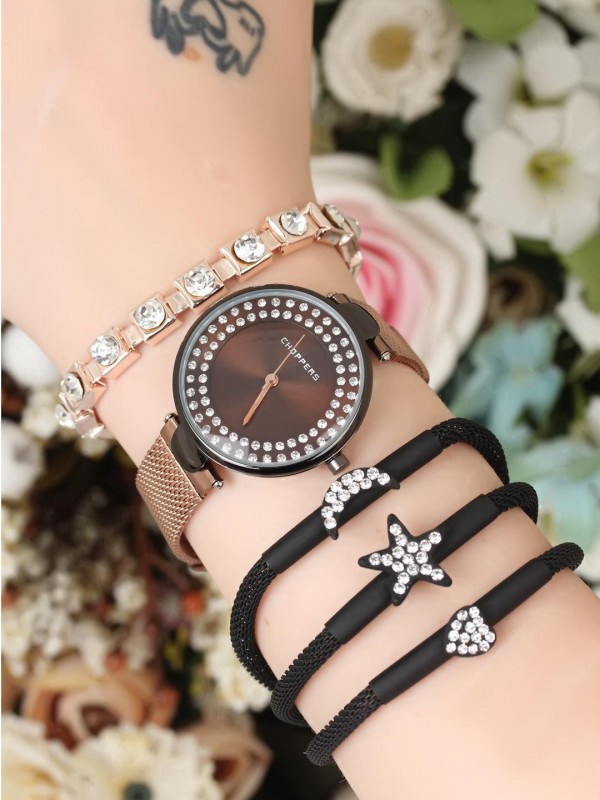Günlük şıklığa önem veren siz şık kadınlar, Çikolata Kahve Renk Kaplama Hasır Metal Kordonlu Yeni Sezon Bayan Saat ve Taşlı Bileklik Kombinine sahip olun.-Saatin yanında kaç adet bileklik varsa saat ile birlikte hepsi geliyor (hepsi fiyata dahil.)