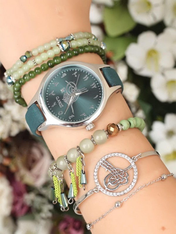Sizde modayı yakından takip eden tarzınızı Clariss Marka Osmanlı Tuğralı Silver  Kasa Turkuaz Deri Kordonlu Bayan Saat ve Boncuklu Bileklik Kombini ile taçlandırın.-Saatin yanında kaç adet bileklik varsa saat ile birlikte hepsi geliyor (hepsi fiyata dahil.)