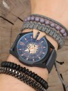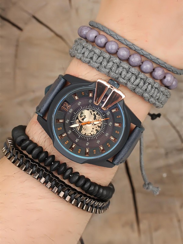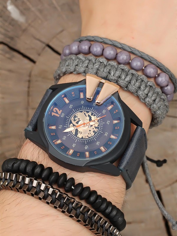 Deri bileklik tasarımlı lacivert Deri Kordonlu Erkek Saat Kombini