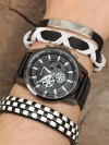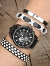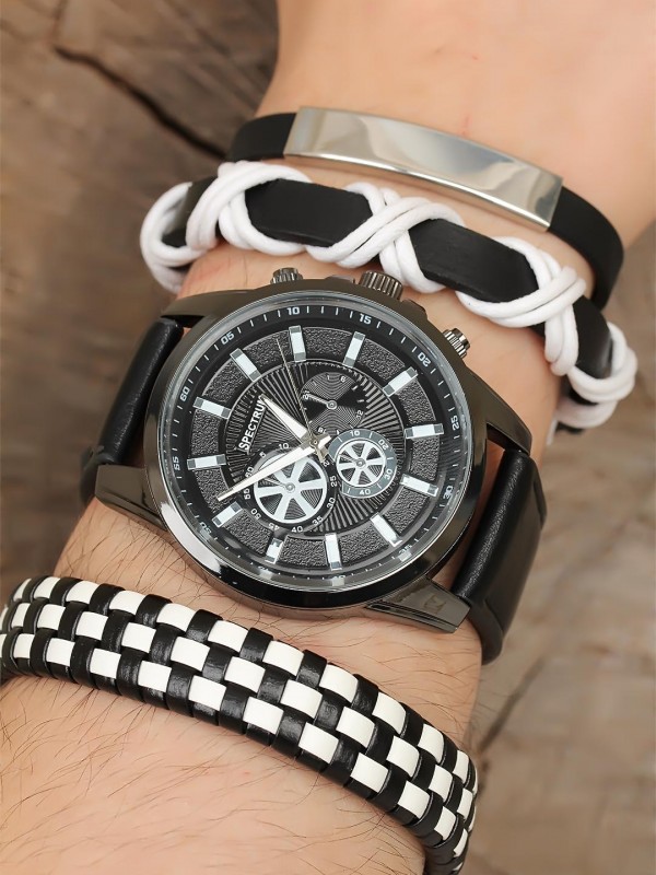 Deri bileklik tasarımlı siyah renk Deri Kordonlu Erkek Saat Kombini -Saatin yanında kaç adet bileklik varsa saat ile birlikte hepsi geliyor (hepsi fiyata dahil.)