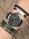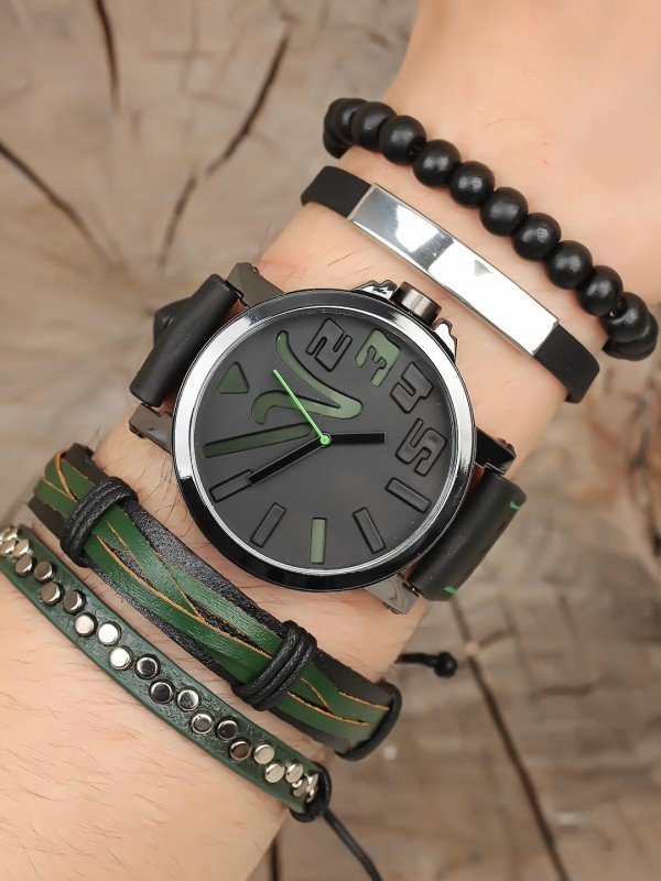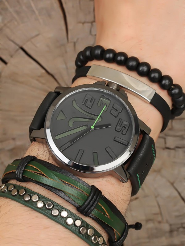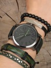 Deri bileklik tasarımlı spor kasa yeşil detaylı siyah renk Deri Kordonlu Erkek Saat Kombini