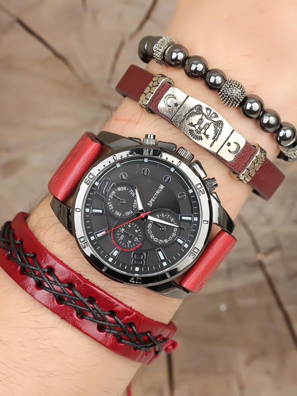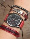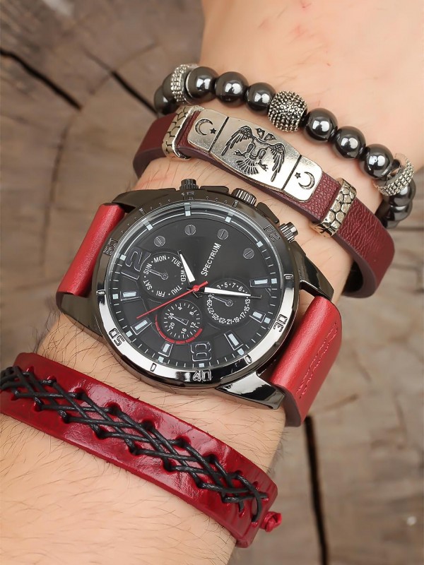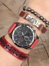 Doğal taş ve deri bileklik tasarımlı bordo renk Deri Kordonlu Erkek Saat Kombini