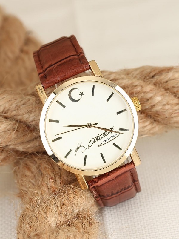 Kahverengi Deri Kordonlu Gold Renk Metal Kasa Atatürk Portreli ve Bayraklı Erkek Saat