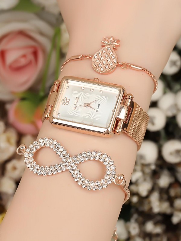 Sonsuzluk ve ananaslı bileklik tasarımlı rose renk Hasır Metal Kordonlu Clariss Marka Bayan Saat Kombini