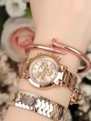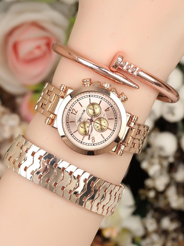Metal ve çivi bileklik tasarımlı rose renk Metal Kordonlu Bayan Saat Kombini -Saatin yanında kaç adet bileklik varsa saat ile birlikte hepsi geliyor (hepsi fiyata dahil.)