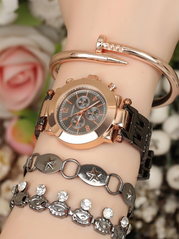 Taşlı metal ve çivi bileklik tasarımlı füme renk Metal Kordonlu Clariss Marka Bayan Saat Kombini -Saatin yanında kaç adet bileklik varsa saat ile birlikte hepsi geliyor (hepsi fiyata dahil.)