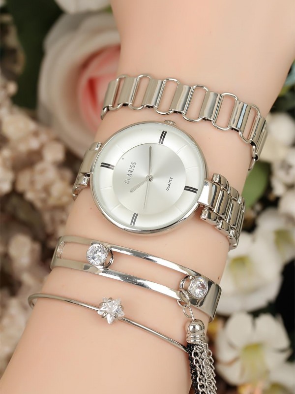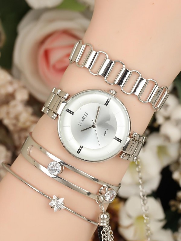 Metal ve kelepçe bileklik tasarımlı silver renk Metal Kordonlu Clariss Marka Bayan Saat Kombini-Saatin yanında kaç adet bileklik varsa saat ile birlikte hepsi geliyor (hepsi fiyata dahil.)