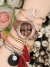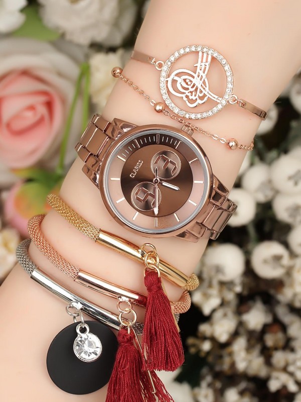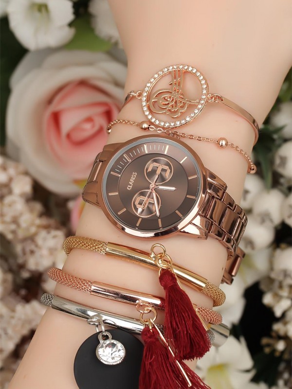Taşlı ve püsküllü bileklik tasarımlı çikolata kahve Metal Kordonlu Clariss Marka Bayan Saat Kombini -Saatin yanında kaç adet bileklik varsa saat ile birlikte hepsi geliyor (hepsi fiyata dahil.)