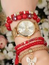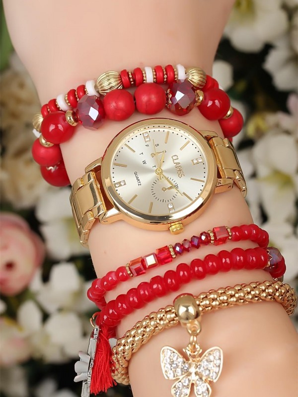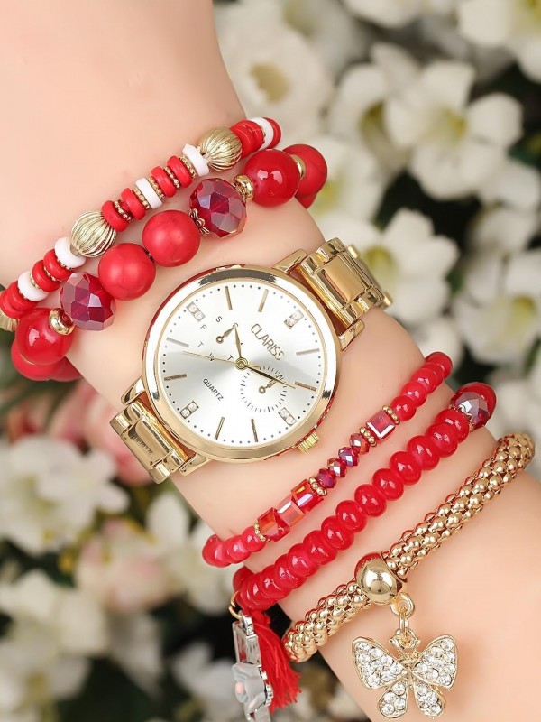 Kelebek tasarımlı Gold Metal Kordonlu Clariss Marka Bayan Saat ve Kırmızı Boncuklu Bileklik Kombini ile günlük tarzınızı güncelleyin.-Saatin yanında kaç adet bileklik varsa saat ile birlikte hepsi geliyor (hepsi fiyata dahil.)